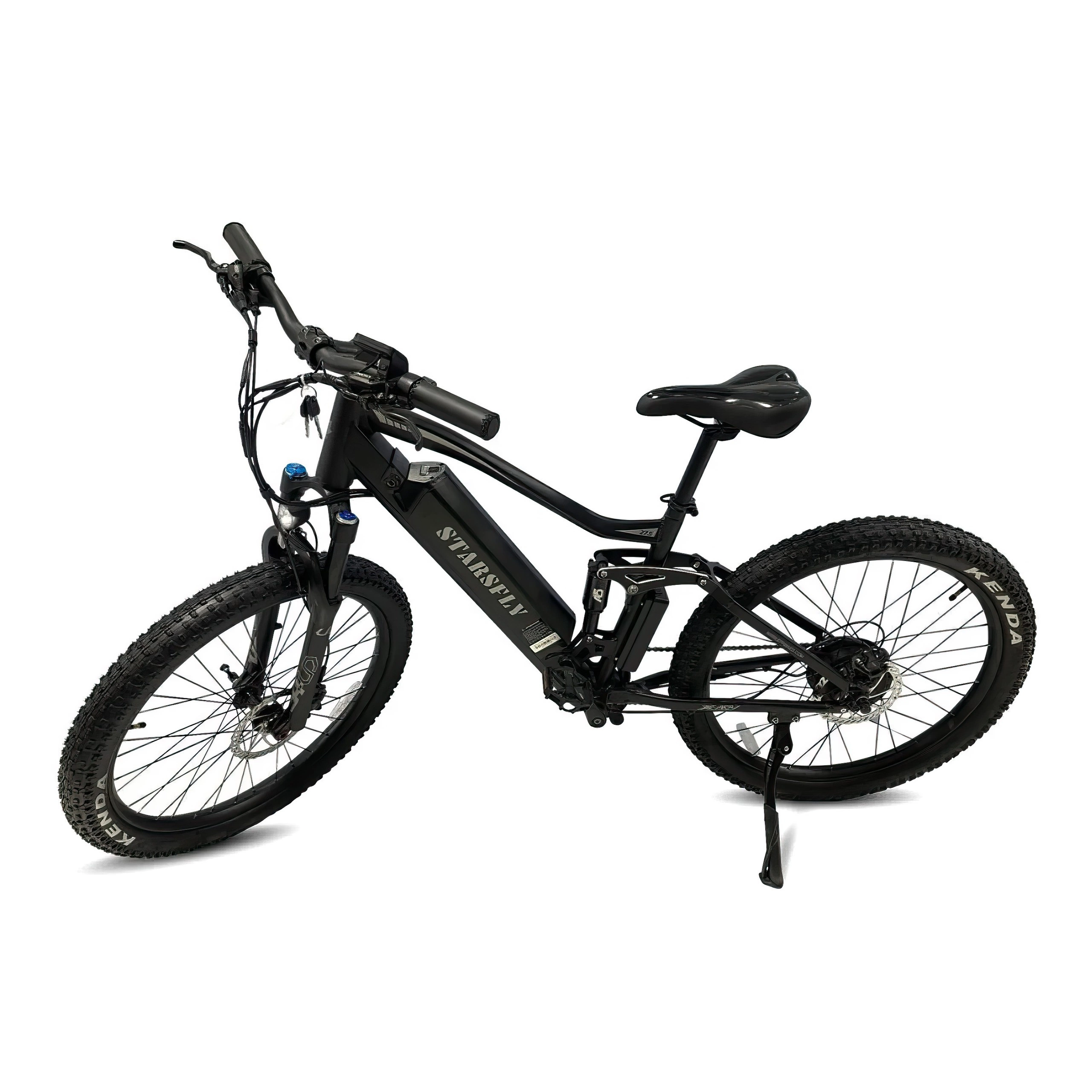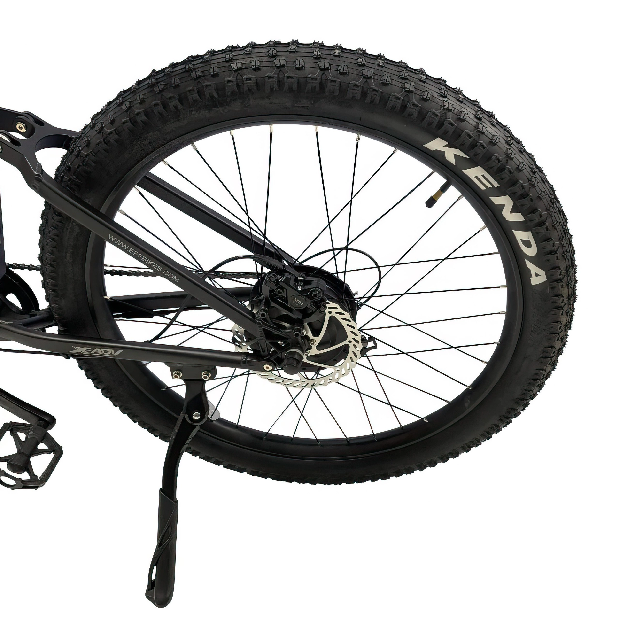 The Lightweight Aluminium Alloy Frame and Kenda 27.5” x 3.0” Tyres provide a robust yet agile structure, ready to tackle different conditions with ease, while the sleek design adds a modern aesthetic.
