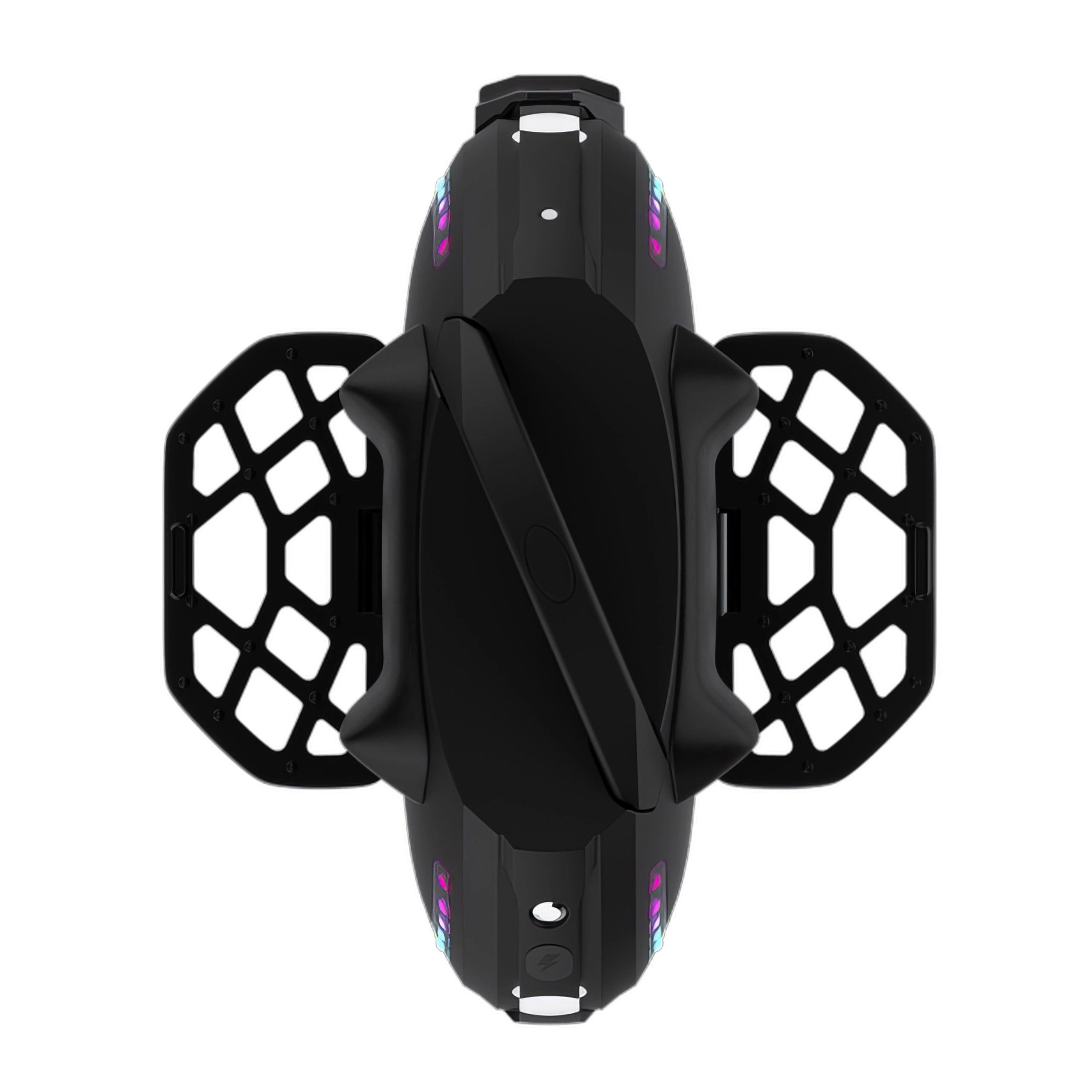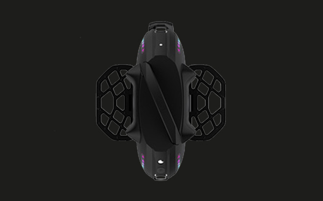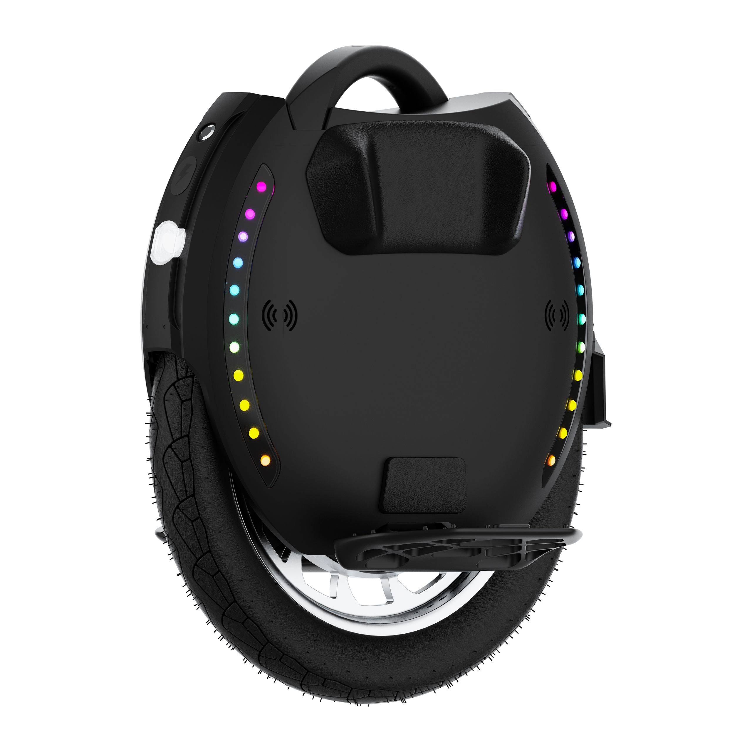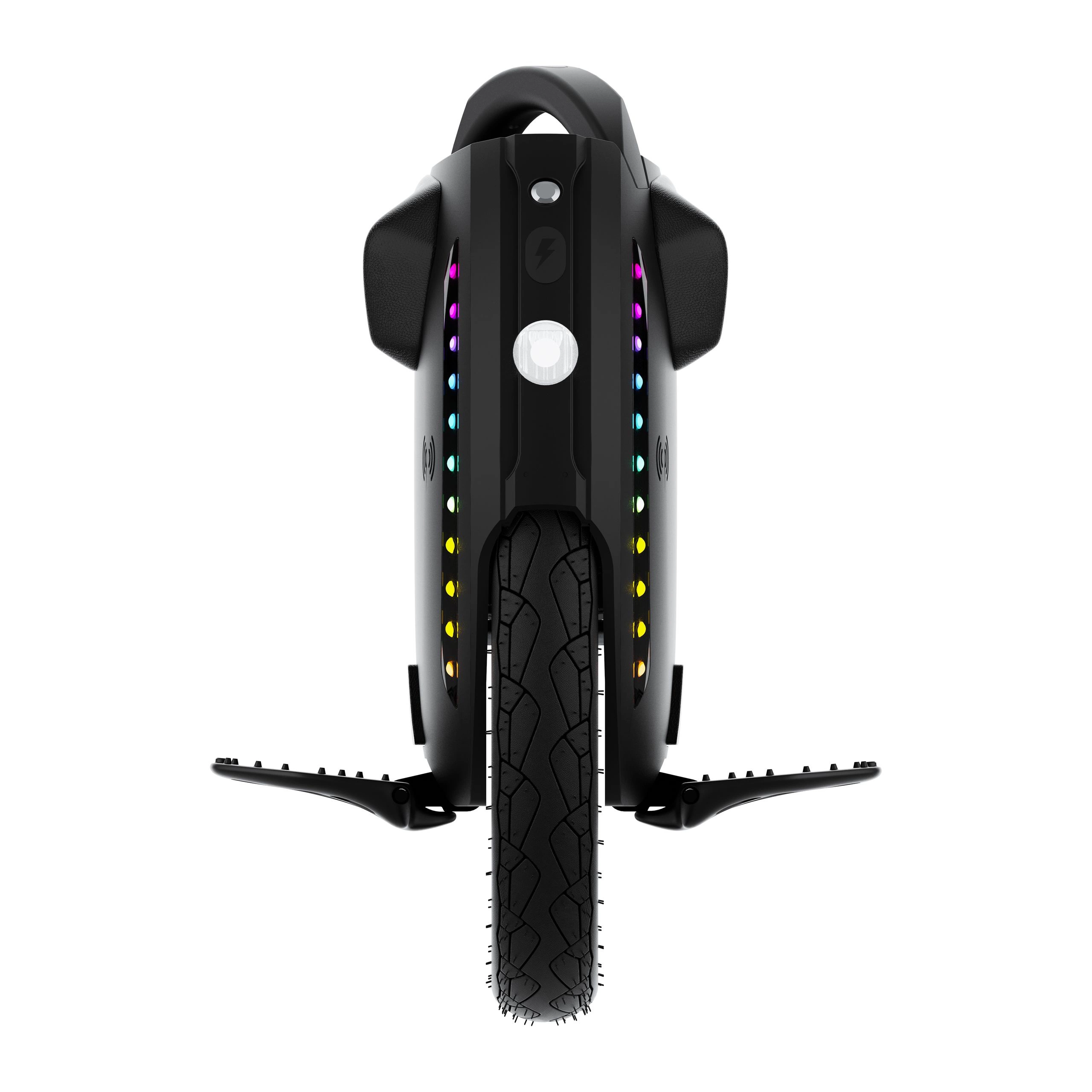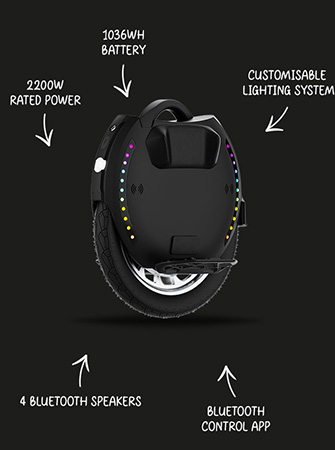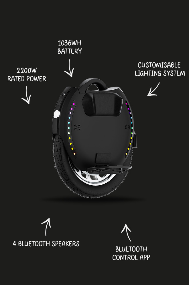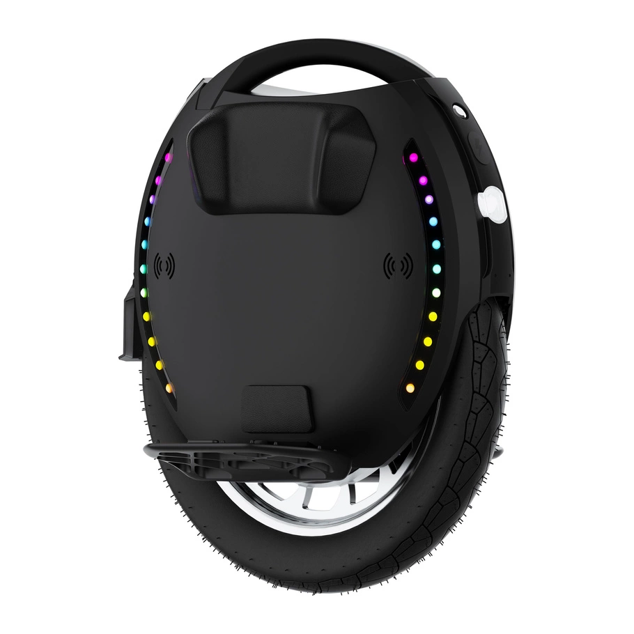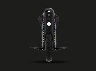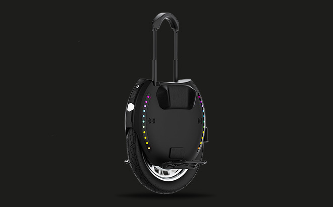 The unicycle features 3W illuminating LED lights and dual 1W braking lights. Two independent light rings provide 360-degree visibility.
