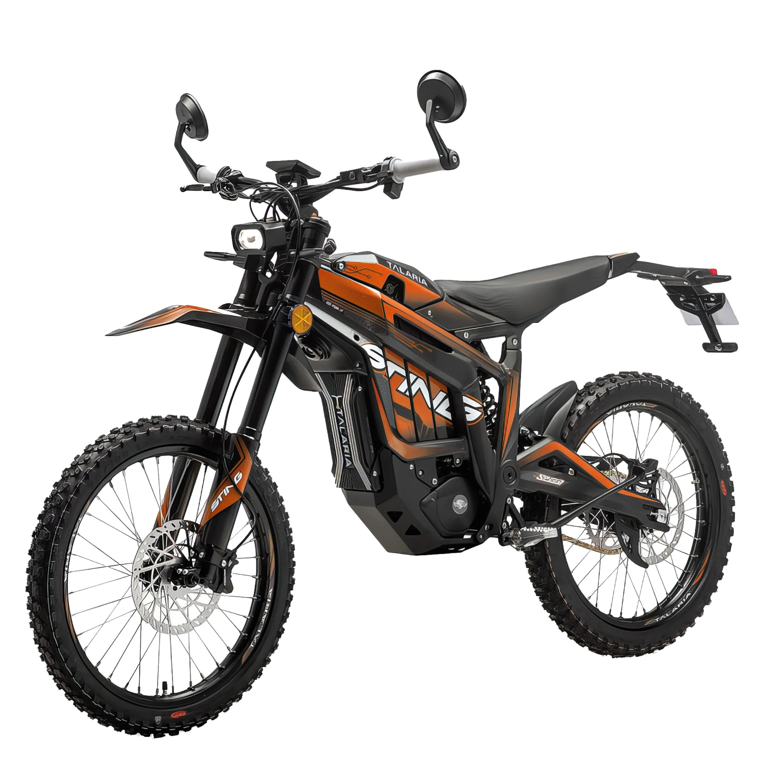 The Talaria Sting R's design tells you exactly what it's for: serious off-road fun. It’s available in 4 colour schemes: black and orange, black and green, black with blue and dark green. Its sharp angles create an aggressive look. The LED headlight adds a modern touch, while the high-mounted fenders and knobby tyres emphasise its dirt-focused purpose. The centrally mounted motor keeps weight low and centred for better handling.